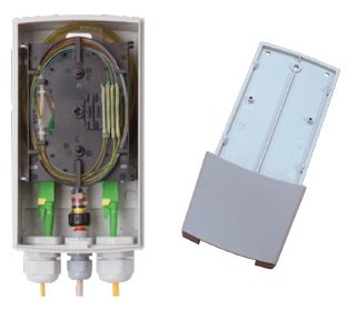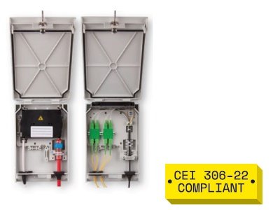 DettagliContenitore a chiave di distribuzione a parete completo di adattatori plastici per 2 bussole SC / SC-APC. Dimensioni 185 x 103 x 73 mm.
