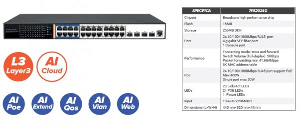 DettagliSwitch Layer3 7PS2024G Novatec 7S5700-48GP-4TF / 7PS2024G - Support hardware watchdog, restore factory Settings, system and port LED - Support ...