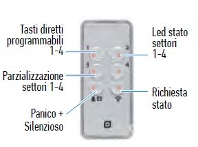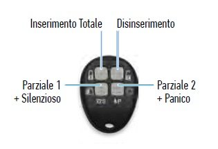 DettagliUn pulsante per inserimento totale, un pulsante per disinserimento. 2 pulsanti per 2 inserimenti parziali o funzioni allarme silenzioso e panico. ...