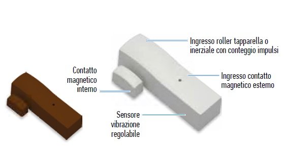DettagliContatto magnetico via radio supervisionato a quadrupla protezione (contatto e shock sensor a bordo, ingresso per contatto esterno, ingresso per ...