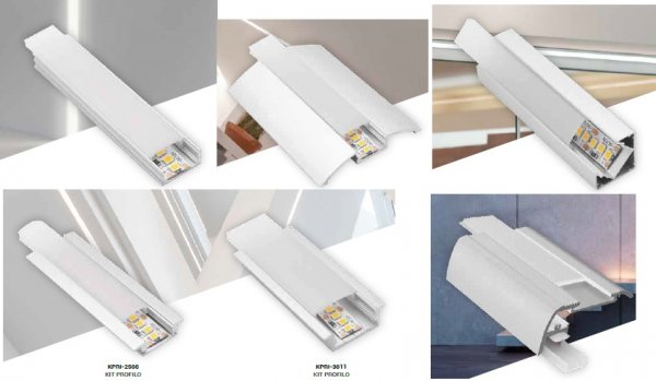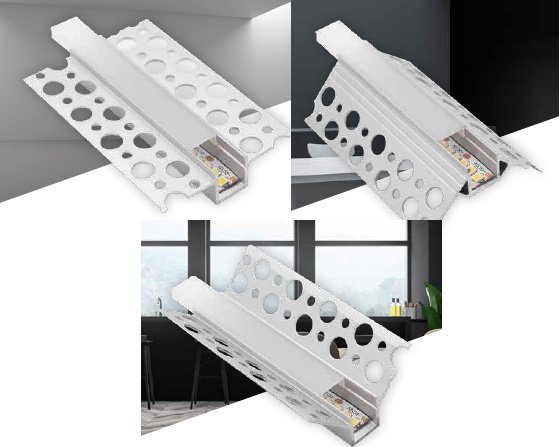 DettagliProfili in alluminio per cartongesso L.3m per strisce Led completo di accessori. Cover opale per un effetto corposo e raffi nato.