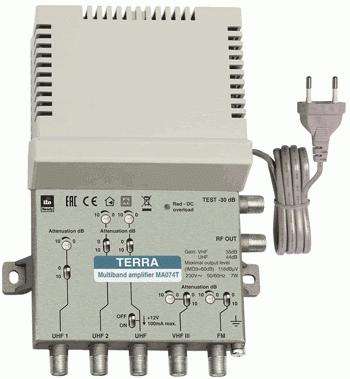 DettagliAmplificatore Terra 4 ingressi (FM+III+U+U) - filtro LTE - Liv Out 121 - guadagno 34/44dB