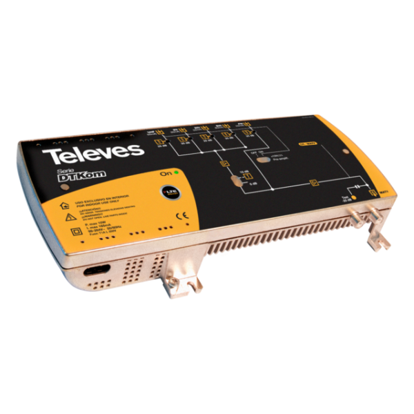 DettagliAmplificatore Televes DTKom 5i/1u “F”: FM-BIII-21..35-38..60-UHF G (21||25)-(36||44)-(40||50)-(42||52)-(42||52)dB Vu 126dBμV ...