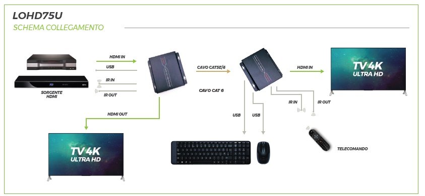 - Trasmette il segnale HDMI video (1080p) fino a 70 metri su