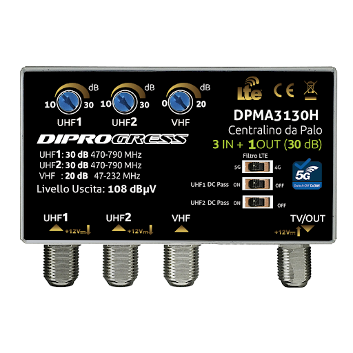 Amplificatore Diprogress DPMA3130H 3 in (V+U+U) 30 dB reg. - Liv Out 108 - 12V, passaggio DC Filtro 5G ...