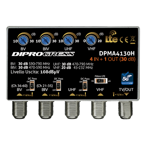 DettagliAmplificatore Diprogress DPMA4130H 4 in (V+B4+B5+U) 30 dB reg. - 12V - Liv Out 108 - passaggio DC Filtro 5G ...