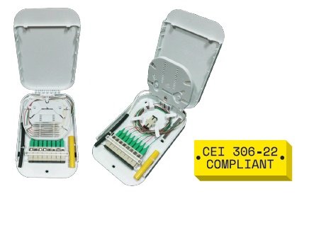 DettagliContenitore per distribuzione a parete fibra passante e prelievo per 12 splices. Dimensioni: 136 x 136 x 46 mm