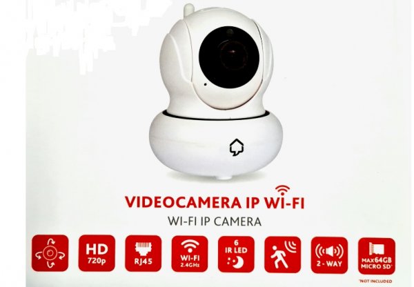 DettagliIP camera Motorizzata Pan 355°/Tilt 90° da interno con risoluzione 720P, Wi-Fi 802.11 b/g/n e connettore Lan RJ45 - Connessione Wi-Fi 2.4GHz ...