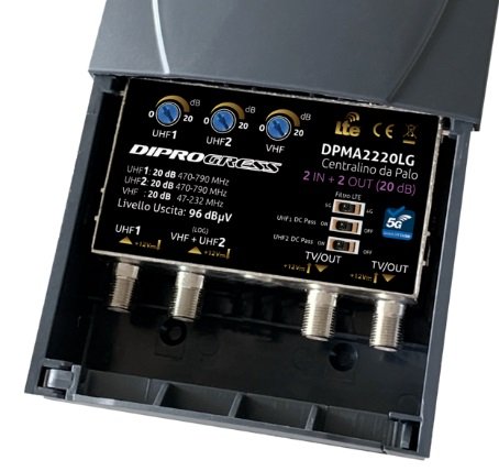DettagliAmplificatore Diprogress DPMA2220LG 2 in (LOG+U) 20 dB reg. - Liv Out 100 - 2 OUT - passaggio DC Filtro LTE 4G/5G selezionabile tramite switch ...