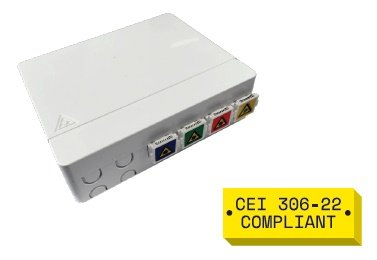 DettagliContenitore STOA completo di 4 adattatori SC-APC shutter (4 colori). Dimensioni: 100 x 80 x 29 mm.