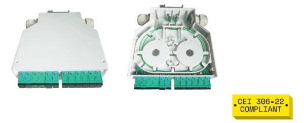 DettagliContenitore a parete per splitter: per esterno, 2 ingressi, completo di 16 bussole FC/PC. Misure: 260x320x90mm