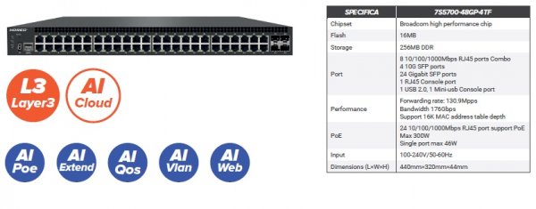 DettagliSwitch Layer3 7S5700-48GP-4TF / 7PS2024G Novatec 7S5700-48GP-4TF / 7PS2024G - Support hardware watchdog, restore factory Settings, system and port ...